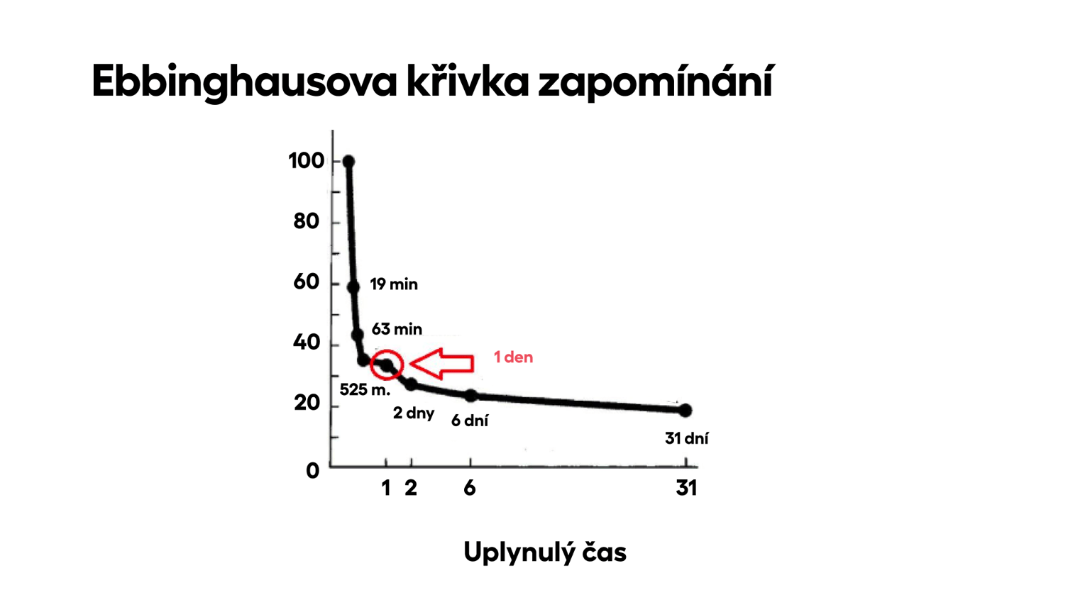 Pokud jste cvičení zvládli, gratulujeme!  Pokud ne, tady je cena útěchy v podobě Ebbinghausovy křivky zapomínání.