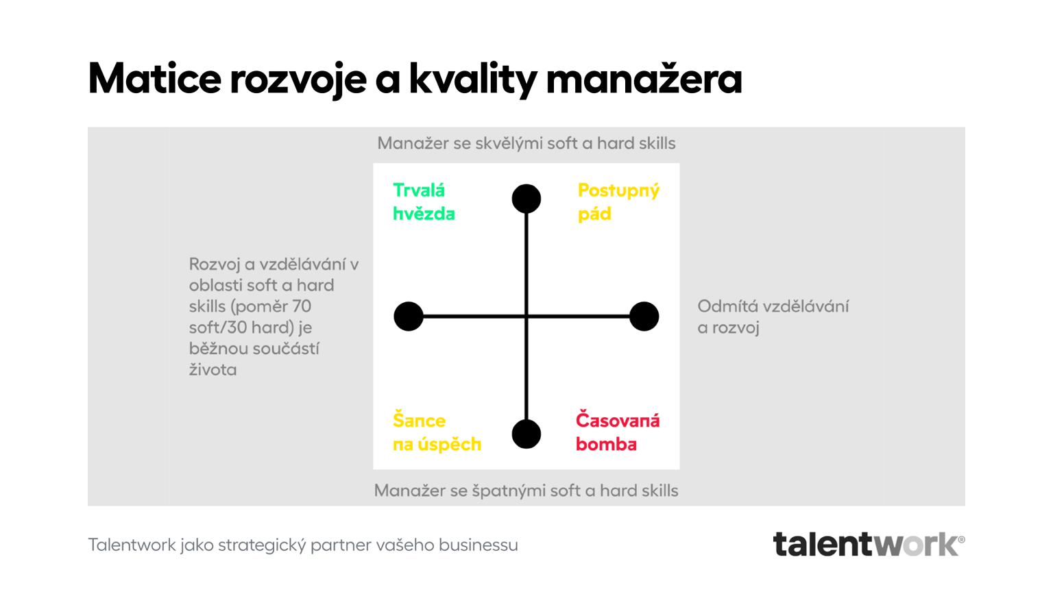 Horizontální rozvoj přináší nové dovednosti a znalosti. V Česku na něm staví většina rozvojových programů. Osvojujeme si nové nástroje i skilly, třeba z projektového managementu, time managementu nebo komunikačních technik. Pokud jste jako Petr prošli řadou takových kurzů a stále stagnujete, možná byste měli prozkoumat svůj potenciál vertikálního rozvoje. Vertikální rozvoj posouvá vaši zralost. Zkoumáte své vzorce myšlení, práci s emocemi, hodnotami, potřebami i motivací. Ano, správně chápete, že tady jde o dlouhodobou a nikdy nekončící práci. Pojďme tedy předpokládat, že ani Petr, ani vy jste se zatím o vertikální rozvoj nepokusili. To ale neznamená, že ho nepotřebujete, časem totiž na vás může čekat postupný pád i časovaná bomba… …jak tomu předejít? Posunout se na úroveň zralého leadera.